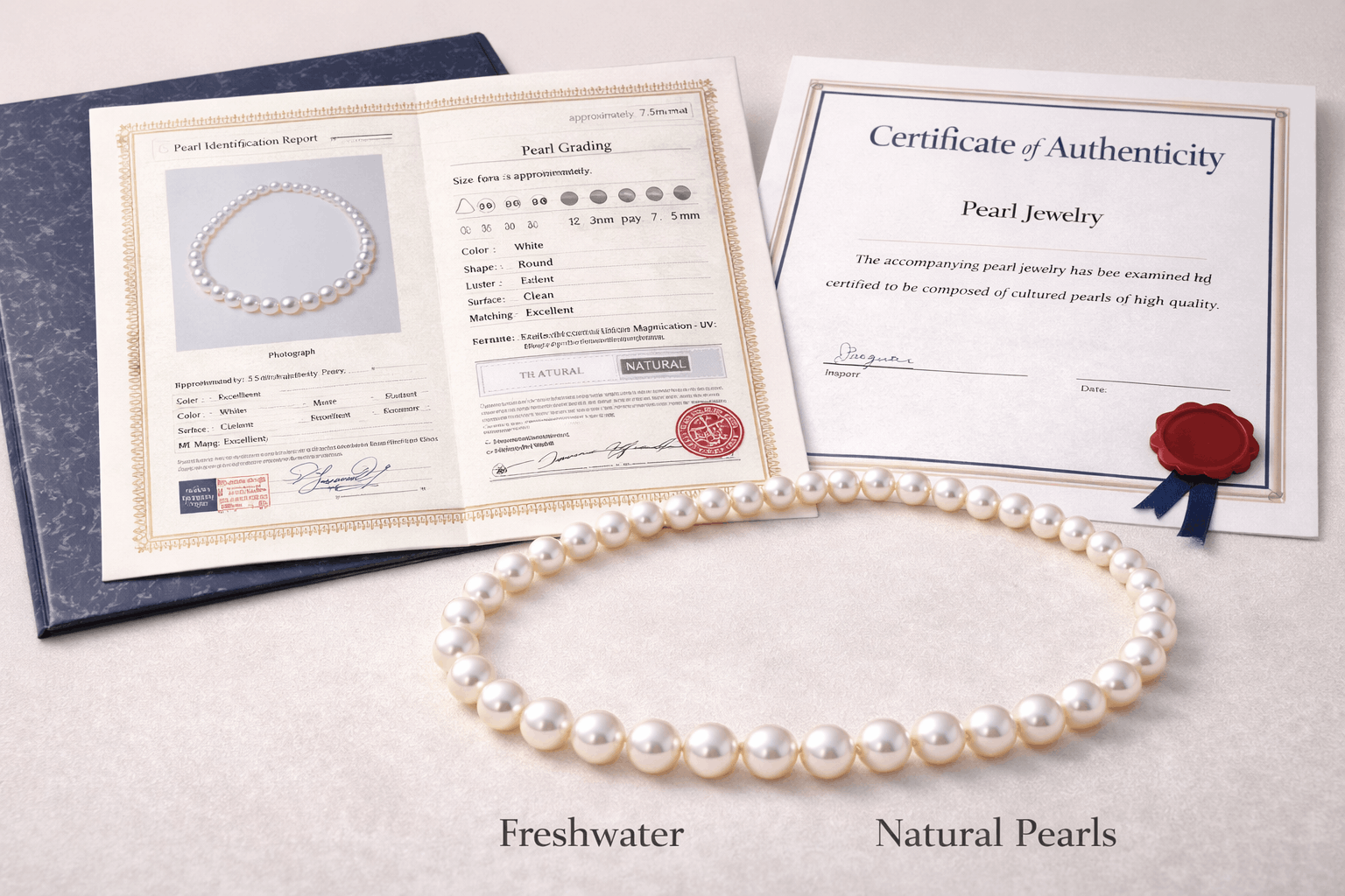 En contraste, PearlsOnly proporciona certificados para todo lo comprado. Especificaciones detalladas incluidas de forma completa. Grado, brillo, superficie, nácar —todo documentado. PSL específicamente para perlas Hanadama. Documentación completa respalda el valor de inversión y posible reventa futura.