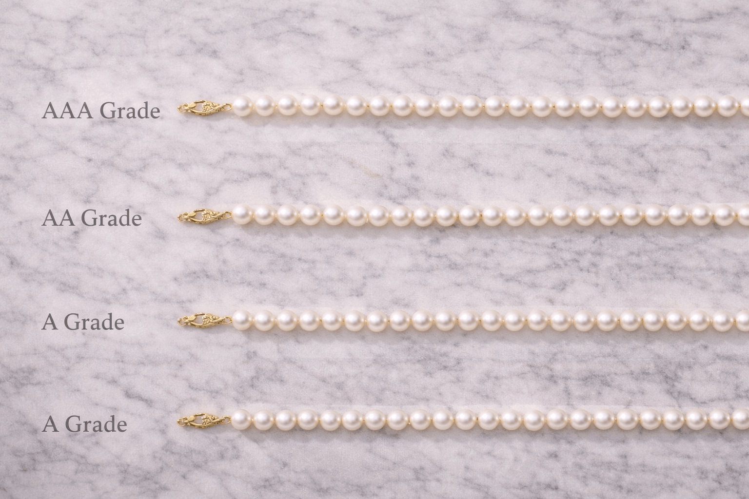 El grado AAA representa la más alta calidad comercial disponible. Superficie casi perfecta con defectos mínimos visibles solo bajo ampliación. Brillo excelente tipo espejo con reflejos nítidos y brillantes. Estas perlas parecen genuinamente premium. Definitivamente vale la pena pagar más por un collar de perlas grado AAA en los EAU si quieres piezas de inversión.