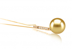 Un suave y satinado oro pendientes de perla de los mares del sur de una fianza de péndulo de oro de 14 K amarillo, adornado con cinco, alrededor de cristales claros. Esta perfecta y sin tacha, perla de oro grado AAA está en el tamaño más grande, mide 10-11 mm. luz llamativa esta perla increíble genera un resplandor de oro silencioso y cálido y un elegante estilo que va bien con el negocio, semi formal y traje formal. Al usar el colgante de Janet con un cuello blanco, abierto, blusa de seda, obtienes un aspecto elegante y sofisticado que te lleva de la oficina para cena de negocios con facilidad. Añadir el colgante de Janet al negro, y tiene un aspecto más rico pulido que está siempre en estilo. Mantener por sí mismo o dar este colgante elegante y llamativo como un regalo de la Dama de honor o un regalo para la novia "algo nuevo".